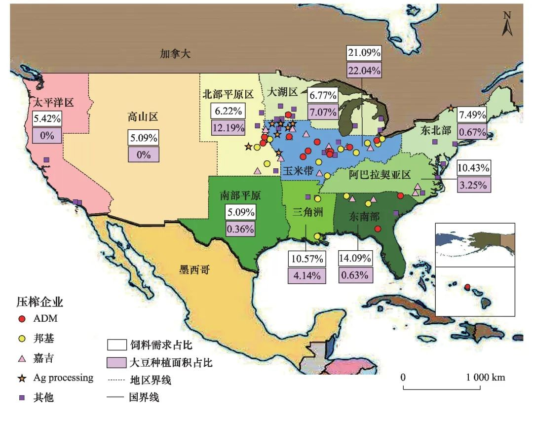 而中国是全球大豆的第一进口国,占全球大豆进口量60%,美国和巴西大豆主要通过海运进口到我国。为了降低运输费用,中国的压榨企业更倾向于在沿海(华南、华东和山东)集聚。其具体分布如下: